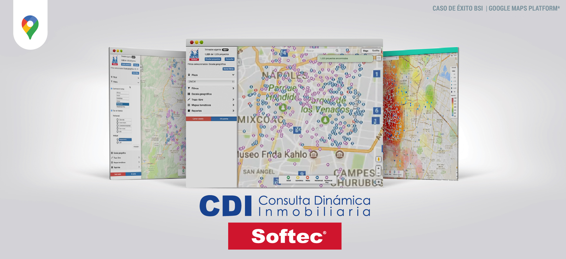 inmobiliaria recopilada por Softec. Está implementada sobre Google Maps Platform, lo